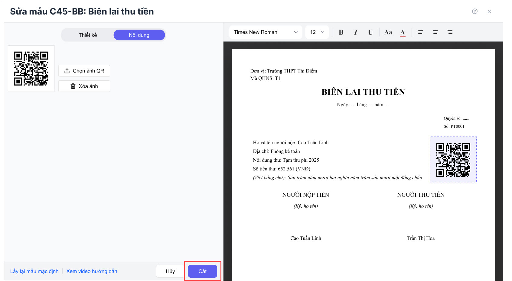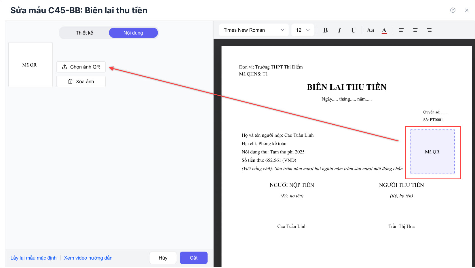 Bước 3: Nhấn chuột vào vị trí mã QR trên biên lai → bấm Chọn ảnh QR và tải ảnh mã QR từ máy tính lên.
