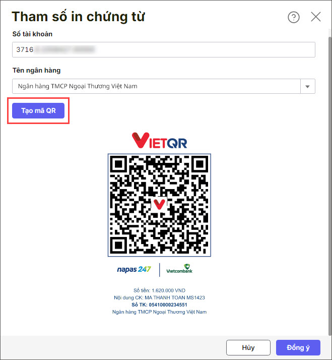- Nhấn Tạo mã QR. Hệ thống sẽ tự động tạo mã QR thanh toán có sẵn các thông tin: Số tiền, Nội dung chuyển khoản,…