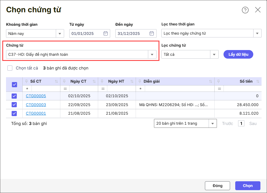 - Chọn loại chứng từ cần in là C37-HD: Giấy đề nghị thanh toán.