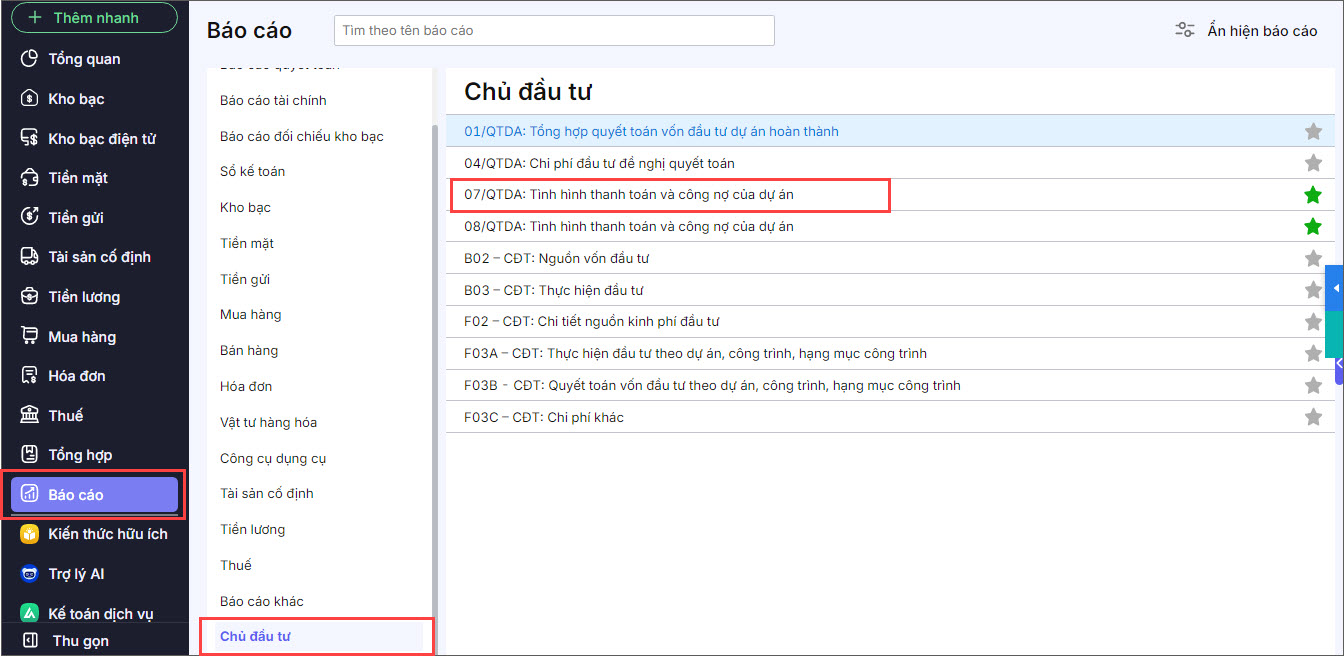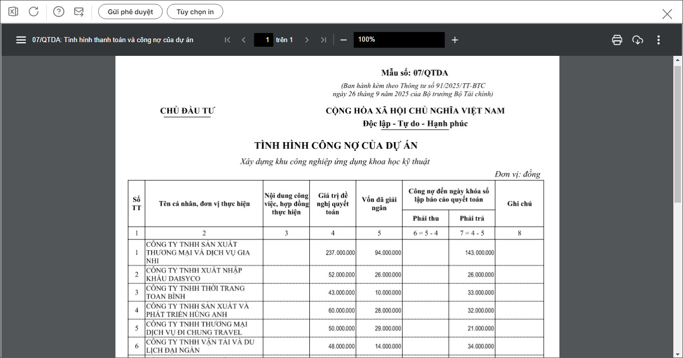 Bước 2: Kích đúp chuột vào mẫu 07/QTDA: Tình hình thanh toán và công nợ của dự án.