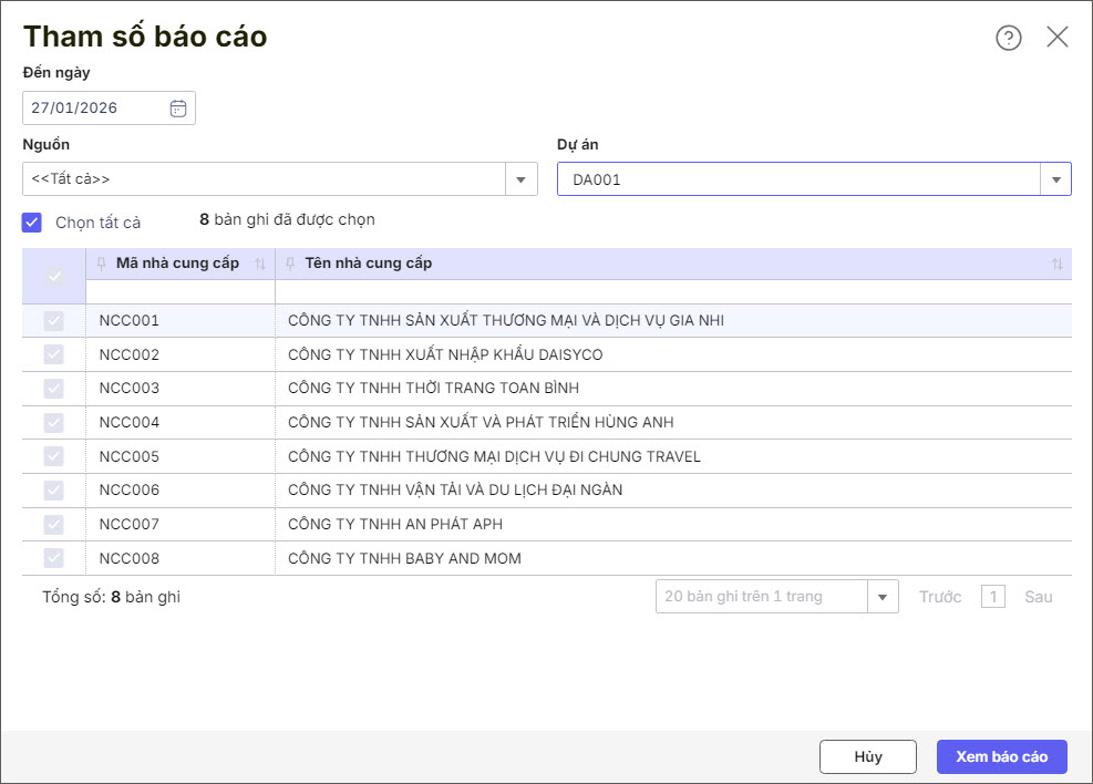Bước 3: Khai báo tham số in và nhấn Xem báo cáo.