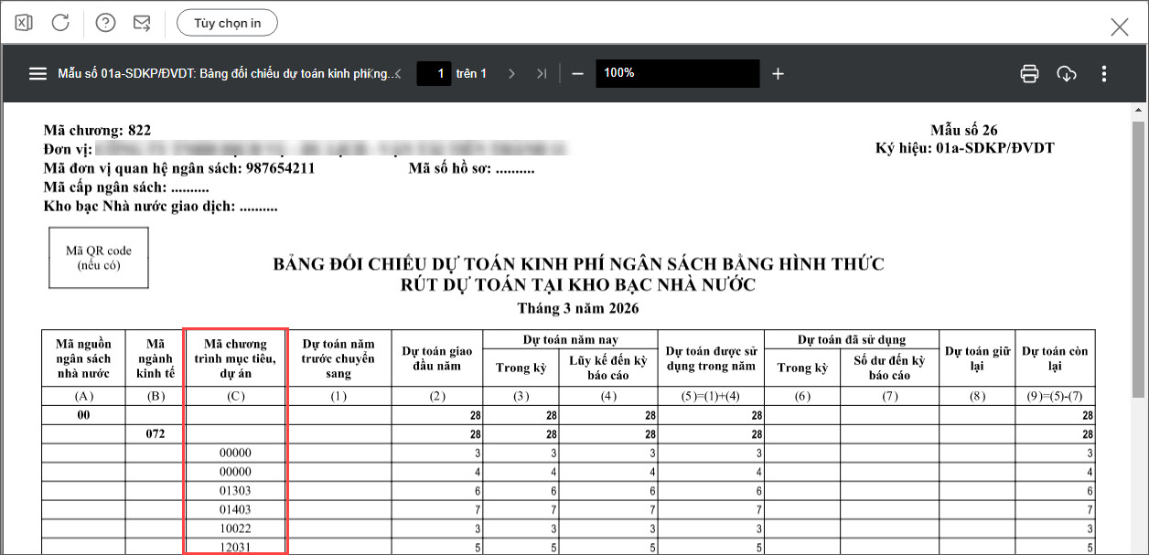 Bài viết này hướng dẫn bạn có thể in mẫu 20a (01a-SDKP/ĐVDT) hiển thị mã CTMT, DA trên bảng nội dung chi tiết là mã CTMT 5 số theo quy định tại Thông tư 18/2020/TT-BTC để tiết kiệm thời gian lập hồ sơ cho đơn vị.