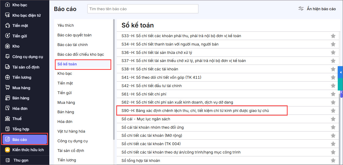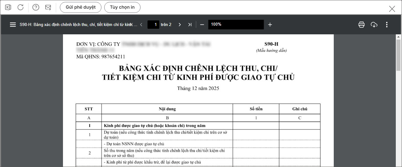 Bài viết này hướng dẫn bạn có thể in mẫu S90-H: Bảng xác định chênh lệch thu, chi, tiết kiệm chi từ kinh phí được giao tự chủ chi tiết theo từng Khoản để nộp cho cấp trên theo quy định.