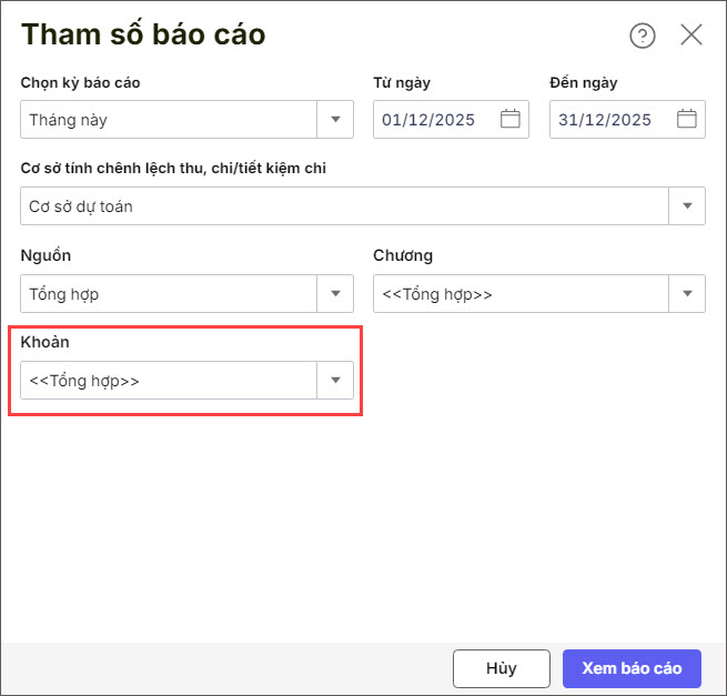 Bước 3: Khai báo tham số in, lưu ý chọn Khoản.
