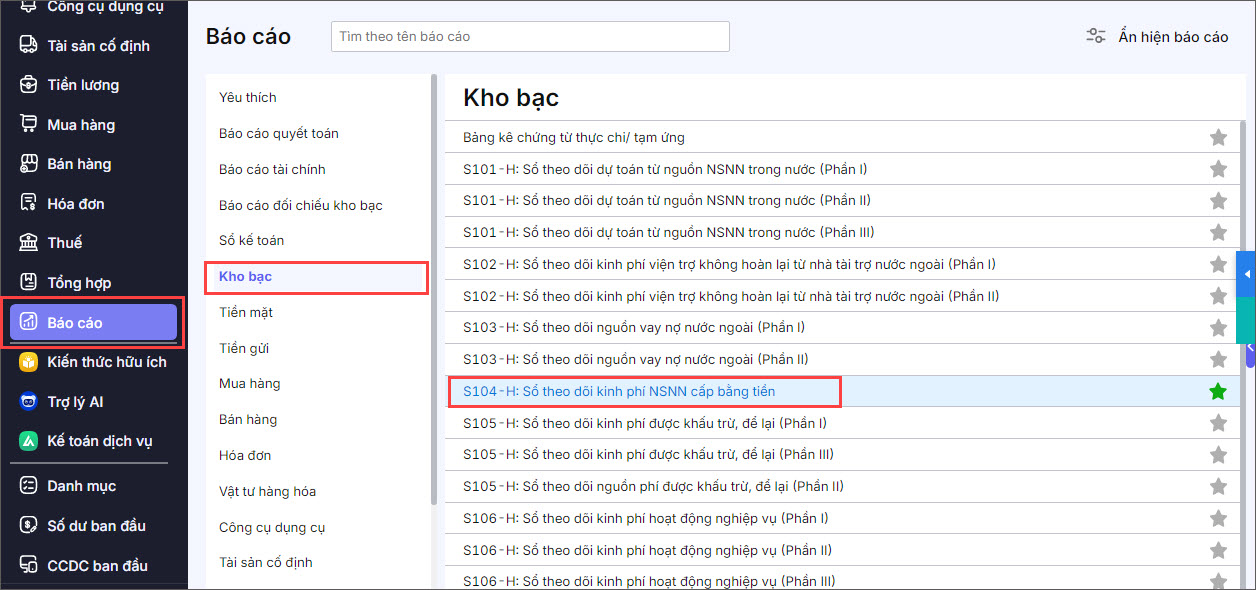Bước 2: Kích đúp chuột vào báo cáo S104-H: Sổ theo dõi kinh phí NSNN cấp bằng tiền.