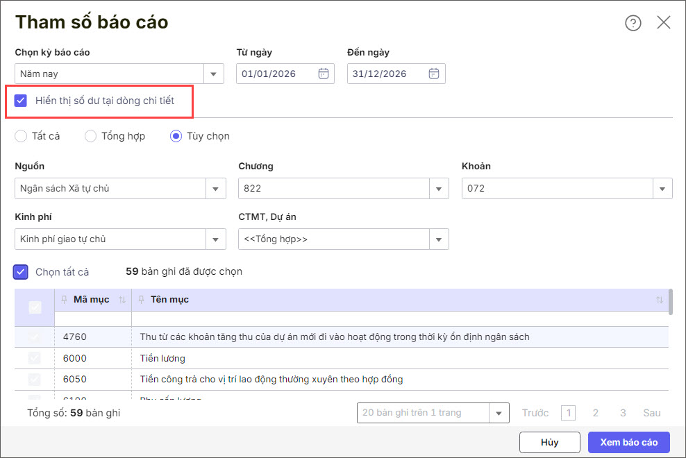Bước 3: Khai báo tham số in báo cáo, lưu ý tích chọn Hiển thị số dư tại dòng chi tiết.