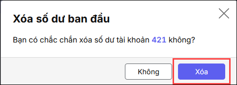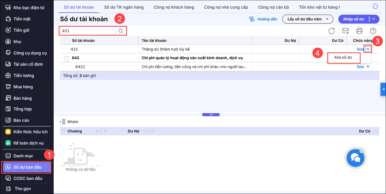 Vào menu Số dư ban đầu, Tìm kiếm TK 421, 468, chọn Xoá số dư