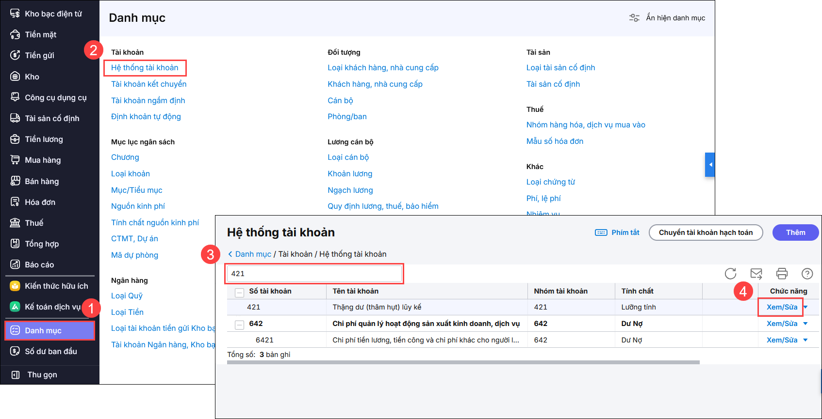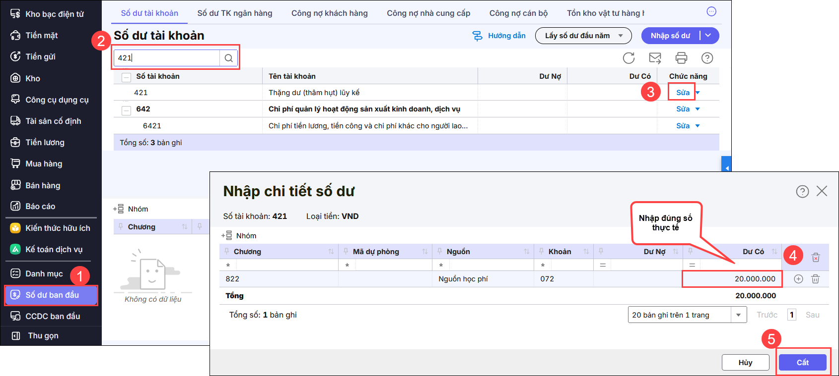 Vào menu Số dư ban đầu tìm đến TK 421, 468 và nhấn sửa. Sau đó, thực hiện nhập lại số dư đúng số tiềnnguồn thực tế.