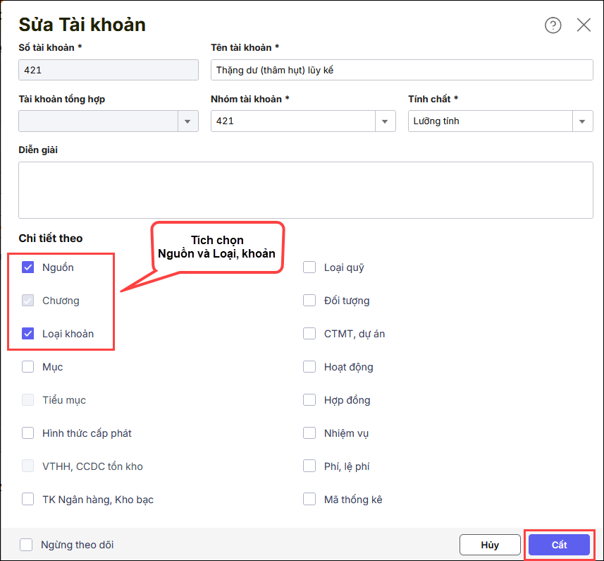 • Tại giao diện Sửa tài khoản, tích chi tiết theo Nguồn, Loại Khoản. Nhấn Cất.