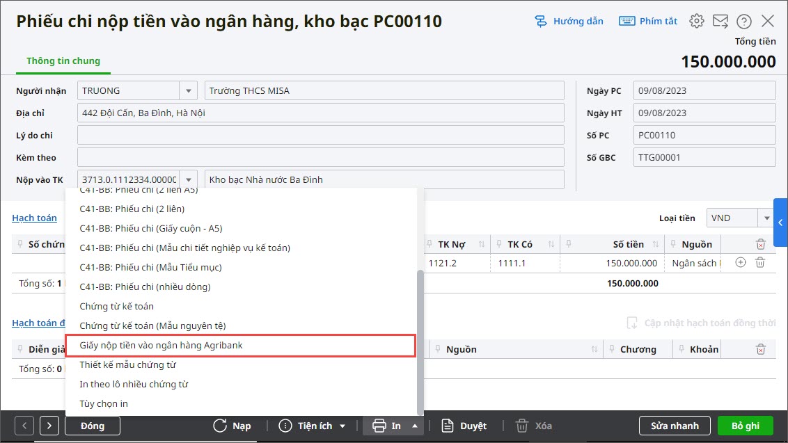 Bước 1: Trên giao diện Phiếu chi nộp tiền vào NH, KB, chọn In mẫu giấy nộp tiền Agribank.
