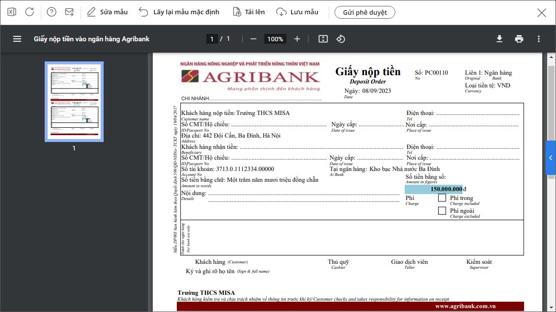 Khi phát sinh các nghiệp vụ rút tiền mặt tại quỹ của đơn vị để nộp vào ngân hàng Agribank, kế toán cần in giấy nộp tiền vào ngân hàng Agribank để phục vụ việc theo dõi và quản lí theo quy định hiện hành.
