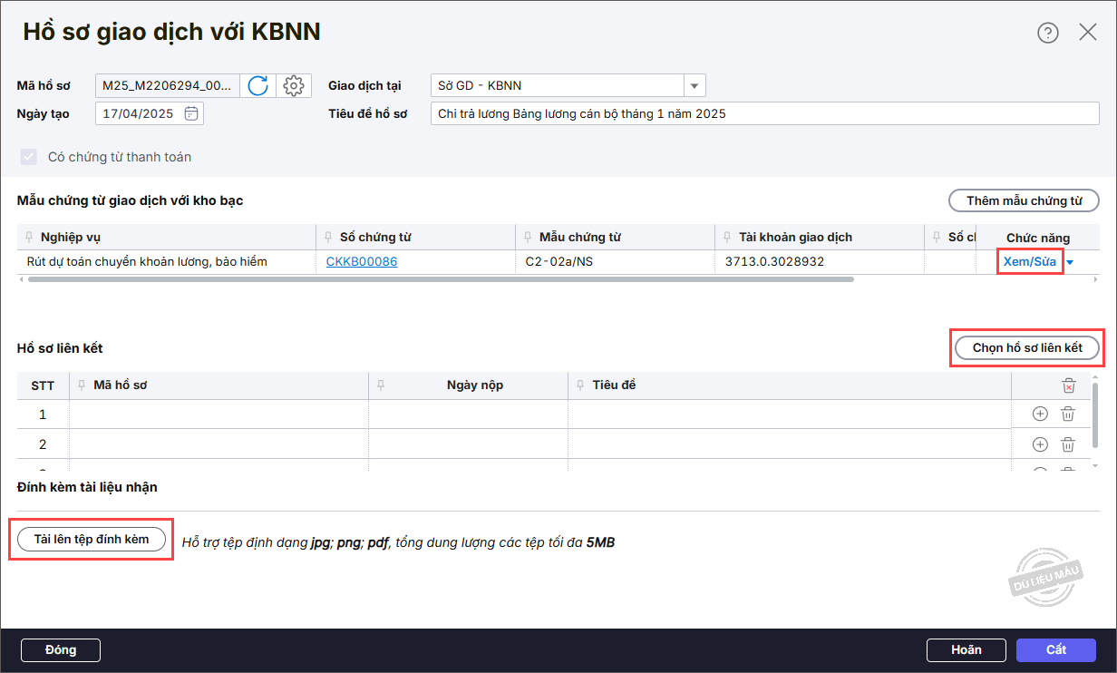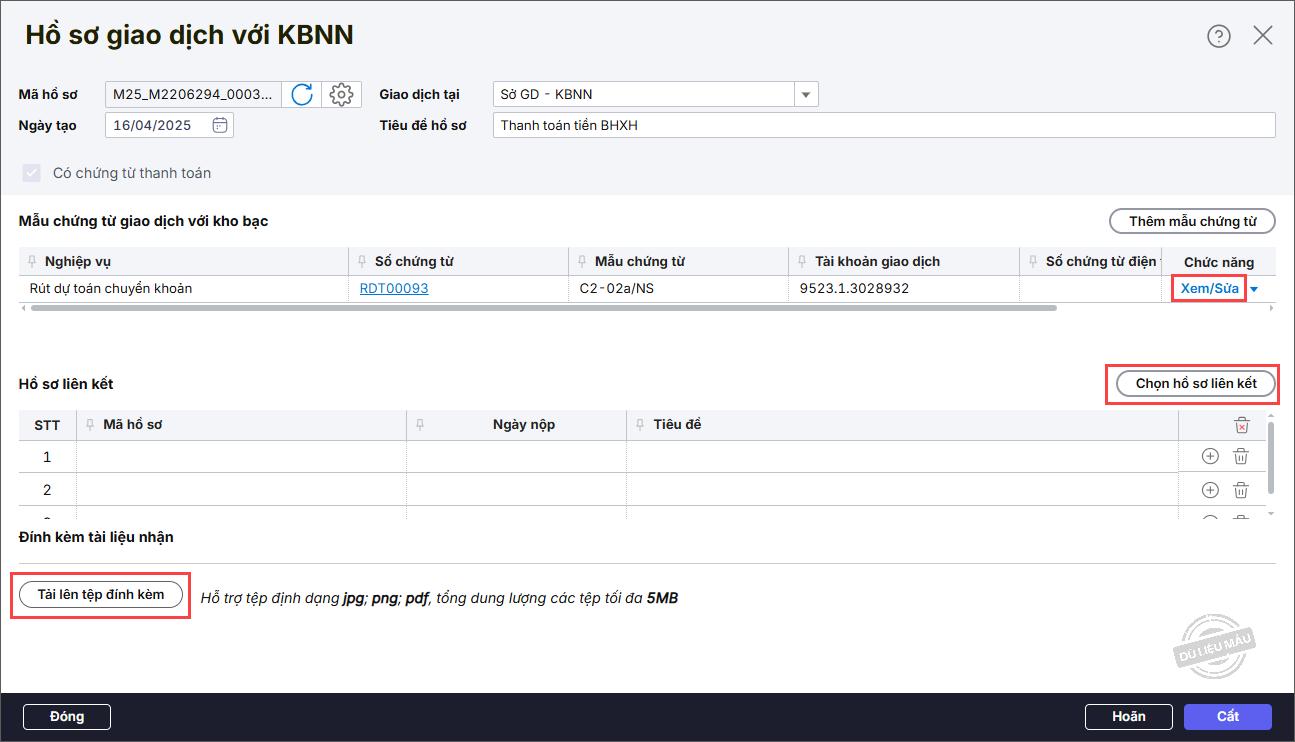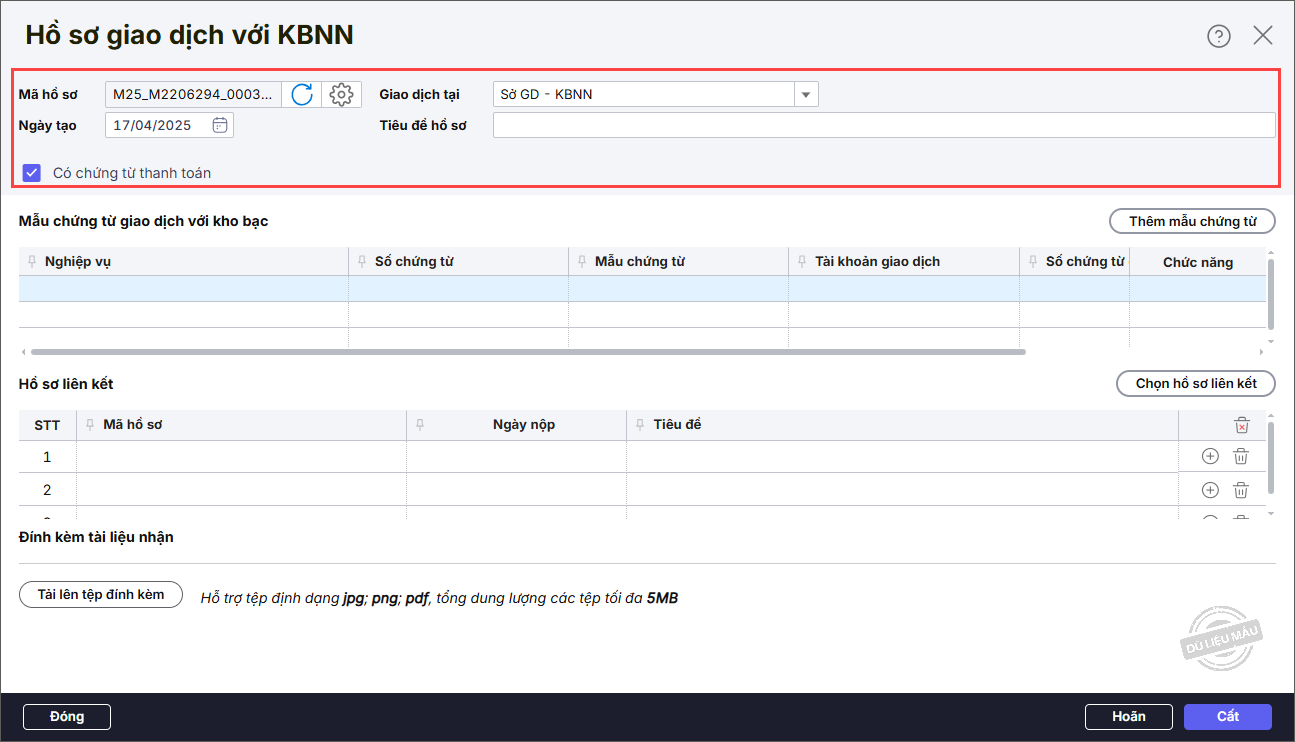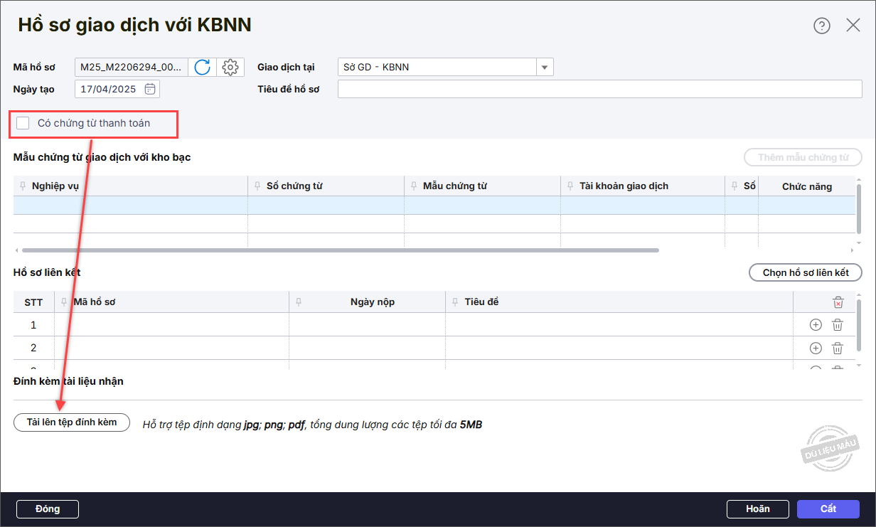 *Lưu ý: Trường hợp anh/chị không tích chọn Có chứng từ thanh toán thì chỉ cần Tải lên tệp đính kèm để đính kèm file và không thể sử dụng chức năng Thêm mẫu chứng từ.