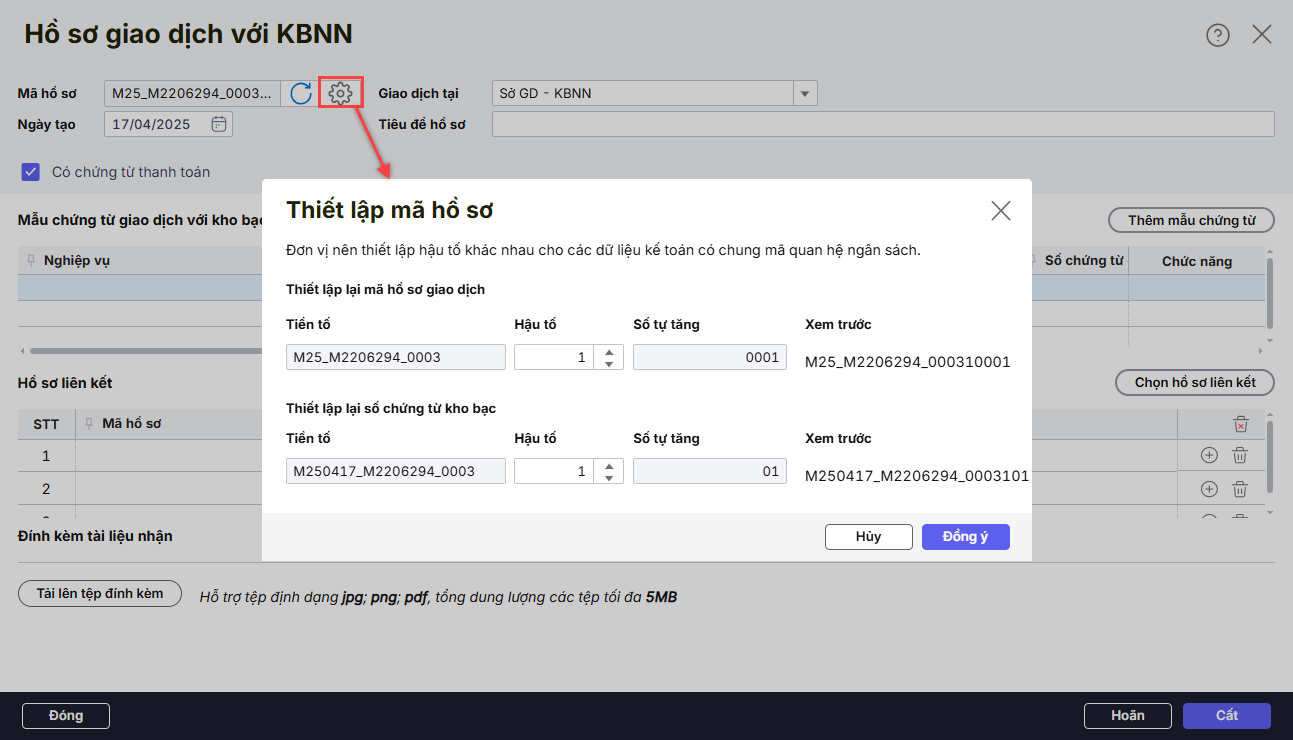 – Mã hồ sơ: Là mã chương trình mặc định. Nếu cần thiết lập lại mã hồ sơ giao dịch và số chứng từ kho bạc thì nhấn vào biểu tượng bánh răng.