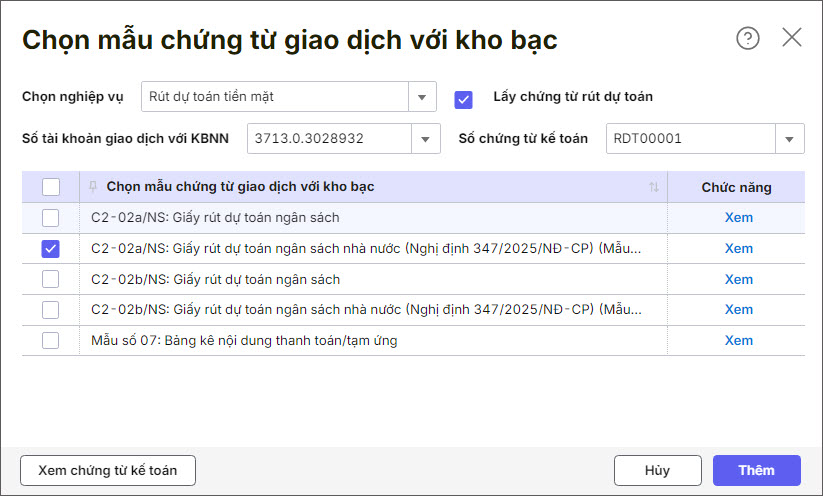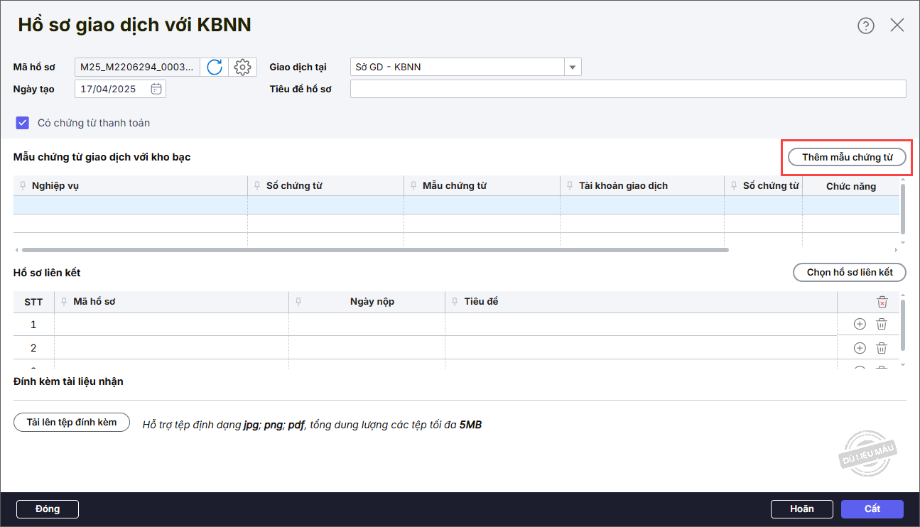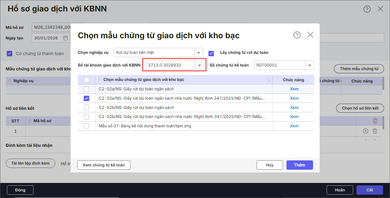 Bước 5: Hệ thống chuyển sang màn hình lập hồ sơ và tự động điền sẵn các thông tin như: Nghiệp vụ, Số chứng từ kế toán và Mẫu chứng từ. Anh/chị chỉ cần chọn thêm Số tài khoản giao dịch với KBNN, rồi nhấn Thêm.