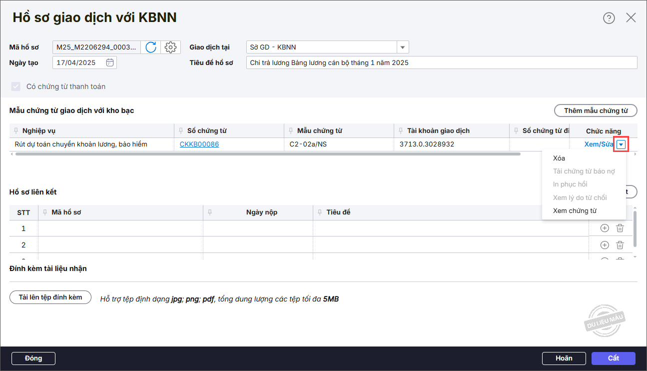 - Nhấn vào dấu mũi tên cạnh Xem/Sửa, chọn Xóa để loại bỏ chứng từ khỏi hồ sơ.