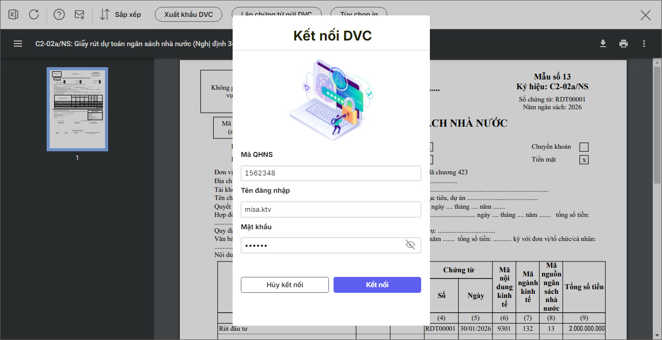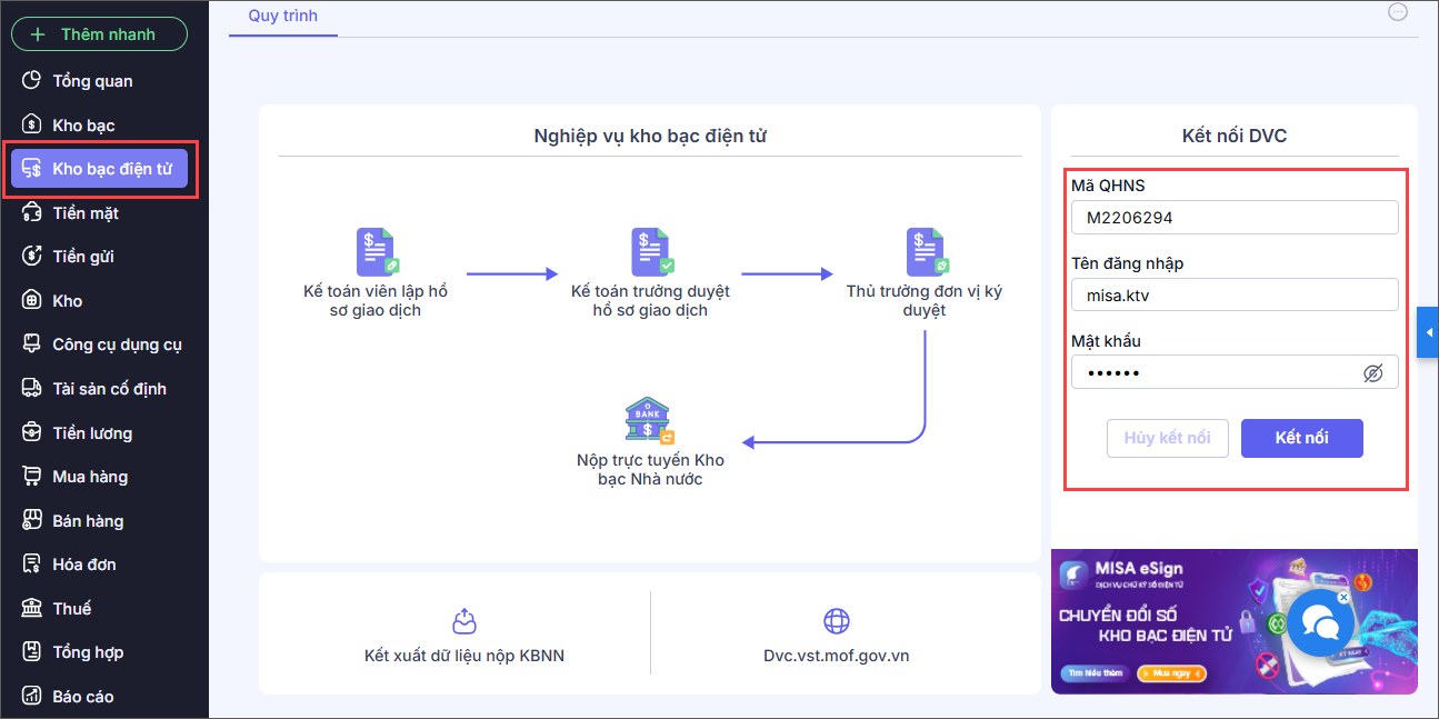 Lưu ý: Cần nhập đúng tên đăng nhập và mật khẩu giống như khi đăng nhập trên Cổng DVC Kho bạc (dvc.vst.mof.gov.vn). Đồng thời, đơn vị phải đã đăng ký sử dụng Kho bạc điện tử của MISA và được Kho bạc chấp nhận theo hướng dẫn tại đây thì mới kết nối được.