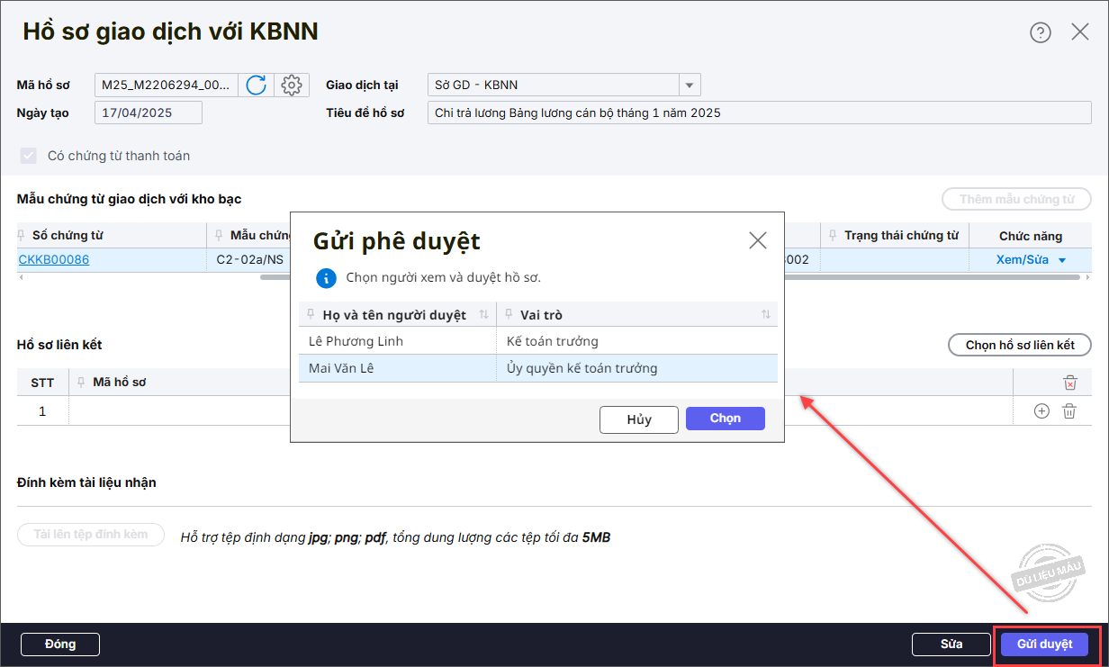 Bước 8: Nhấn Gửi duyệt để gửi hồ sơ cho kế toán trưởng phê duyệt.