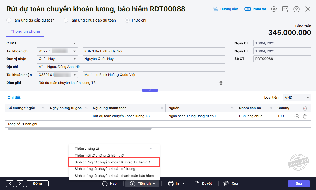 - Hệ thống sẽ mở lại giấy rút dự toán. Vào Tiện ích và chọn sinh chứng từ tương ứng.
