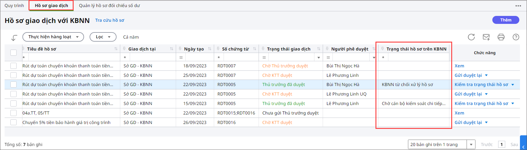 - Sau khi hồ sơ được gửi lên DVC KBNN, anh/chị có thể theo dõi trạng thái hồ sơ tại màn hình danh sách Hồ sơ giao dịch, cột Trạng thái hồ sơ trên KBNN.