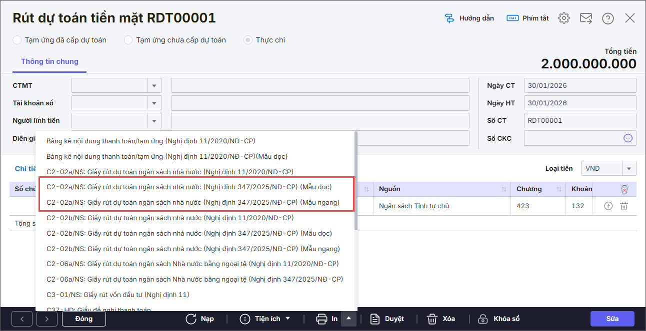 Bước 1: Trên Giấy rút dự toán hoặc chứng từ Chuyển khoản kho bạc đã lập, nhấn In và chọn in mẫu C2-02a/NS: Giấy rút dự toán ngân sách nhà nước (Nghị định 347/2025/NĐ-CP)