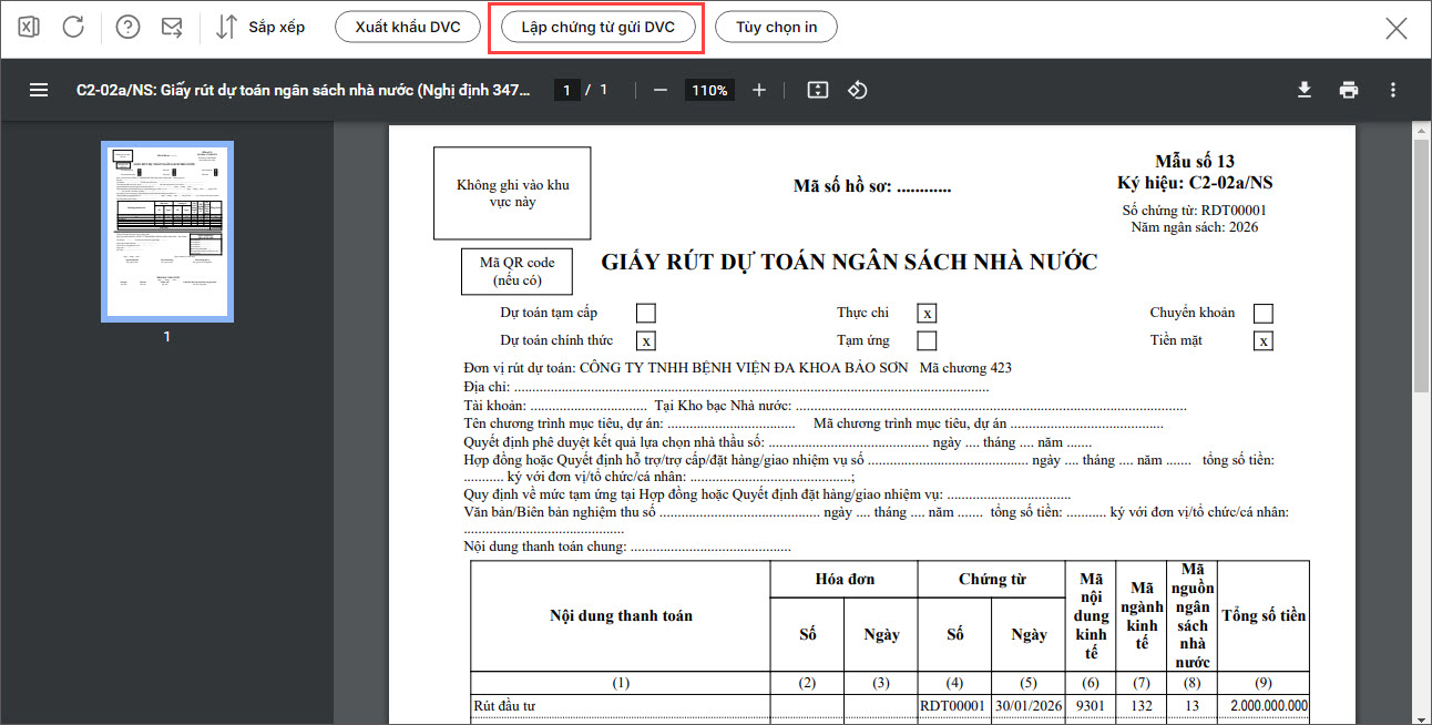 Bước 3: Trên giao diện xem trước chứng từ in, nhấn Lập chứng từ gửi DVC.