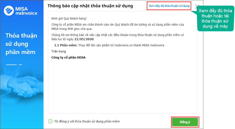 - Đọc kỹ thỏa thuận sử dụng phần mềm, sau đó tích chọn vào Tôi đồng ý với thỏa thuận sử dụng phần mềm.