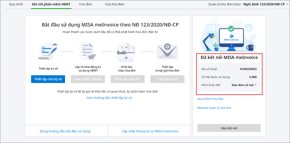 - Sau khi kết nối meInvoice thành công, anh/chị xem được các thông tin: Mã số thuế, Số hóa đơn được sử dụng, Hình thức hóa đơn.