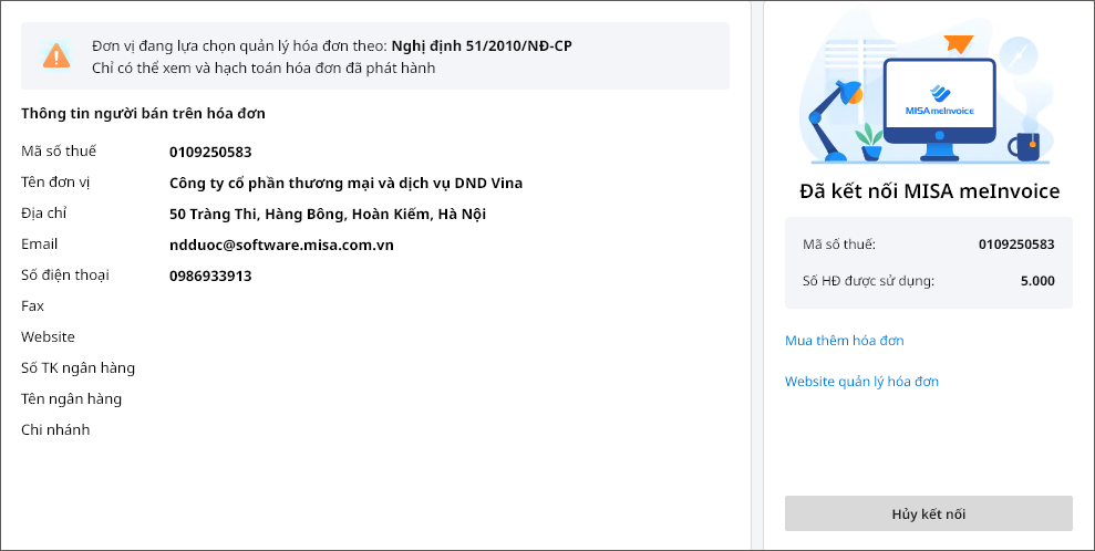 - Còn nếu muốn hủy kết nối với MISA meInvoice thì nhấn Hủy kết nối.