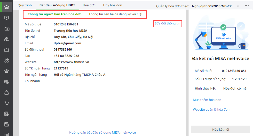 - Nếu cần sửa lại các thông tin trên, nhấn Sửa đổi thông tin để sửa trực tiếp trên phần mềm meInvoice.