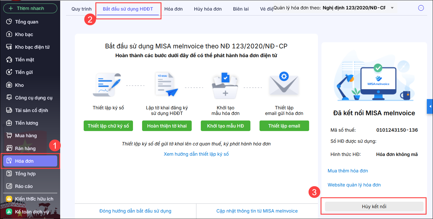 Lưu ý: Để hủy kết nối hóa đơn điện tử MISA Meinvoice.vn, thực hiện như sau: