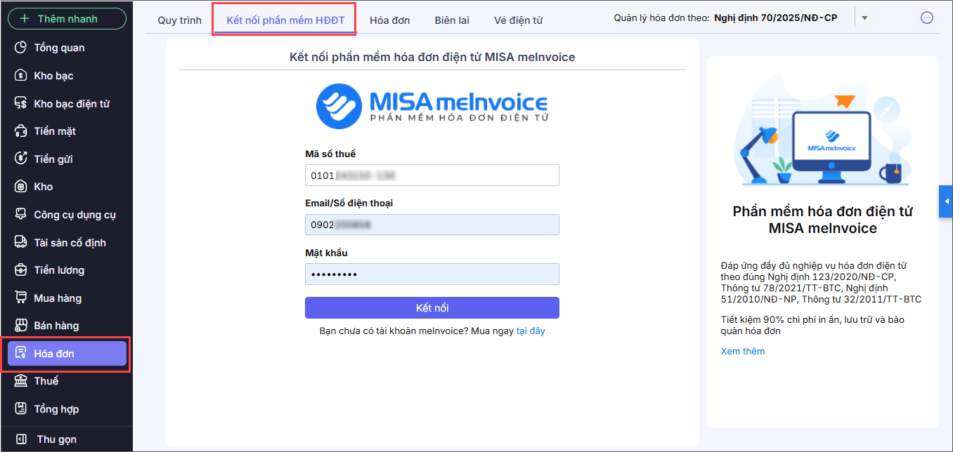Bước 3: Nhập thông tin tài khoản để kết nối đến meInvoice (là thông tin đăng nhập vào MISA meInvoice): Mã số thuế, Email hoặc số điện thoại, Mật khẩu.