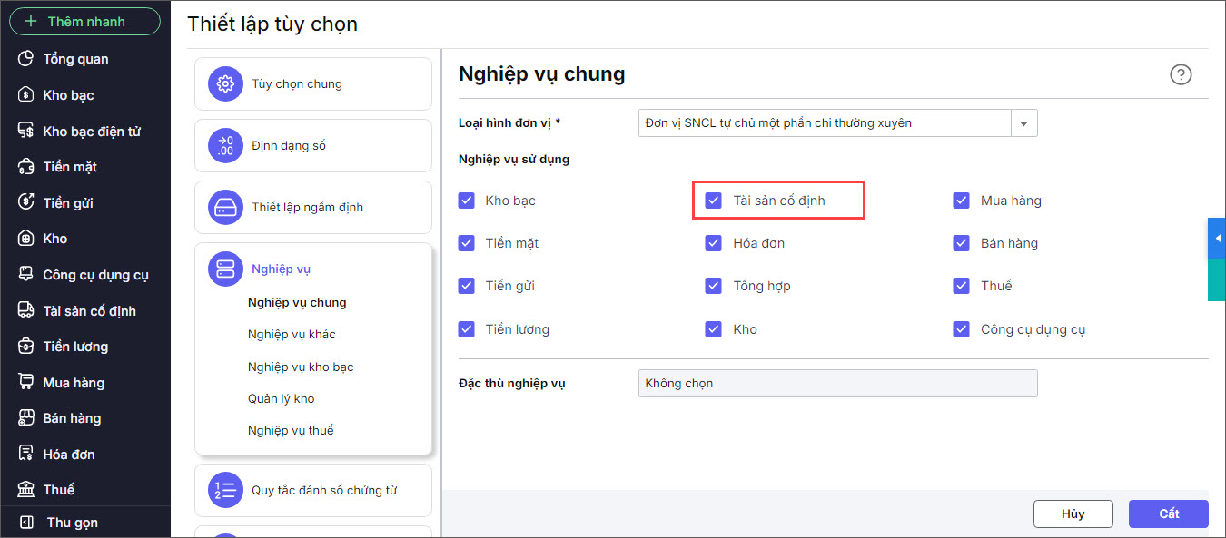 *Lưu ý: Để phần mềm hiển thị cột Mã tài sản trên chứng từ, đơn vị cần tích chọn Tài sản cố định tại phần Nghiệp vụ\Nghiệp vụ chung. Xem hướng dẫn tại đây