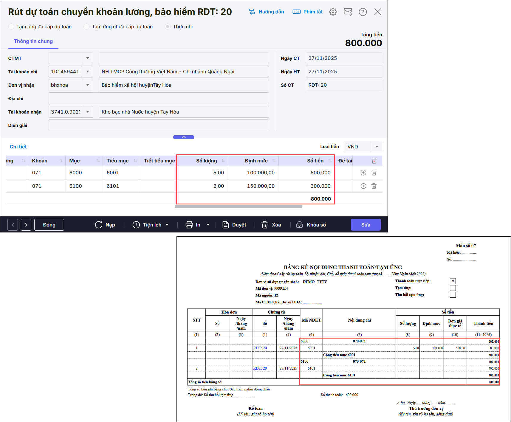- Nếu muốn thêm dòng số liệu thì anh/chị cần mở lại chứng từ rút dự toán, chuyển khoản, bảng kê,… đang xem thêm dòng tương ứng rồi in lại.