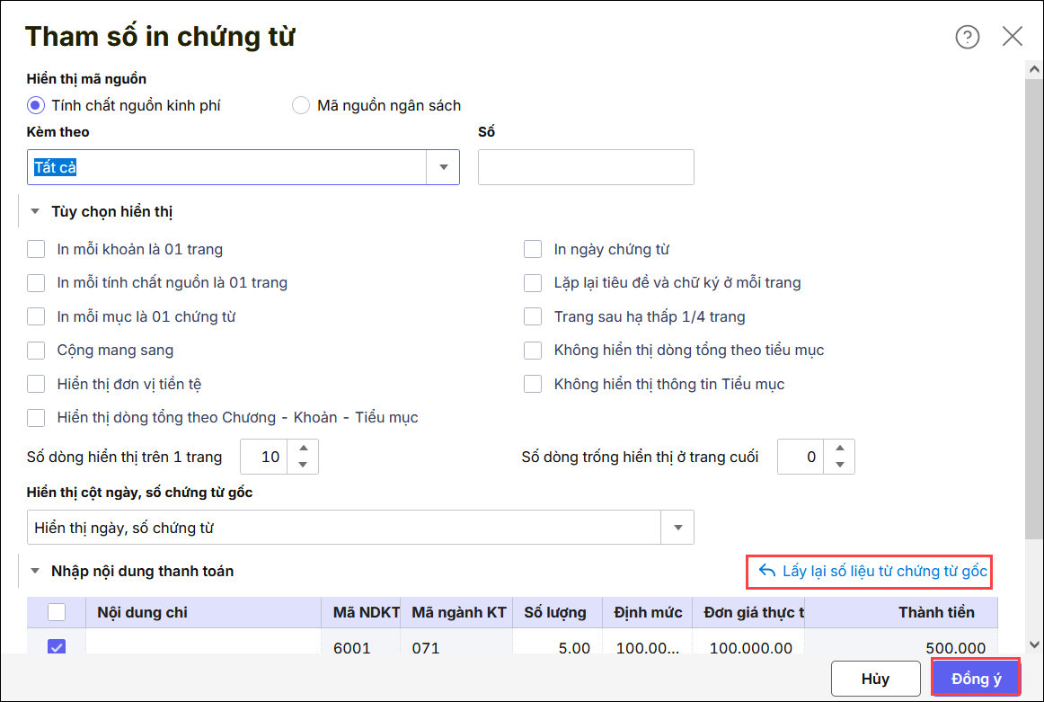 Khi mở lại bảng kê, tại bảng tham số hiện ra anh/chị tích “Lấy số liệu từ chứng từ gốc” để cập nhật lại số liệu rồi nhấn Đồng ý.