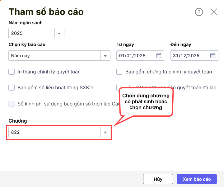 Nguyên nhân 1: Do tham số báo cáo khi in đang chọn Chương không có phát sinh để in