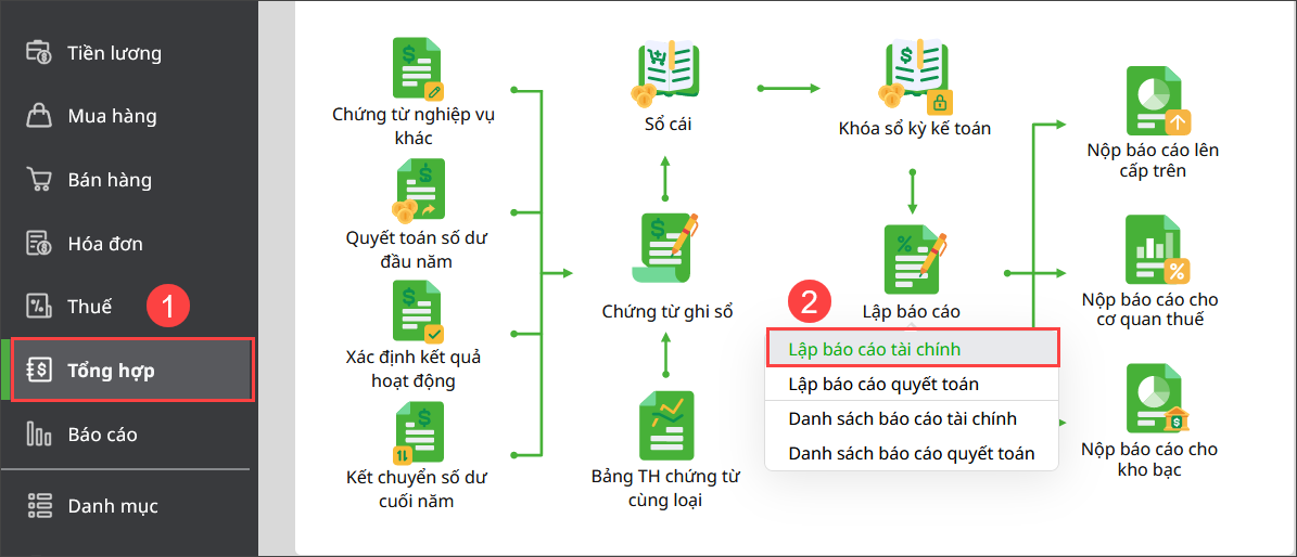 Bước 1: Vào phân hệ Tổng hợp\Lập báo cáo\Lập Báo cáo tài chính.