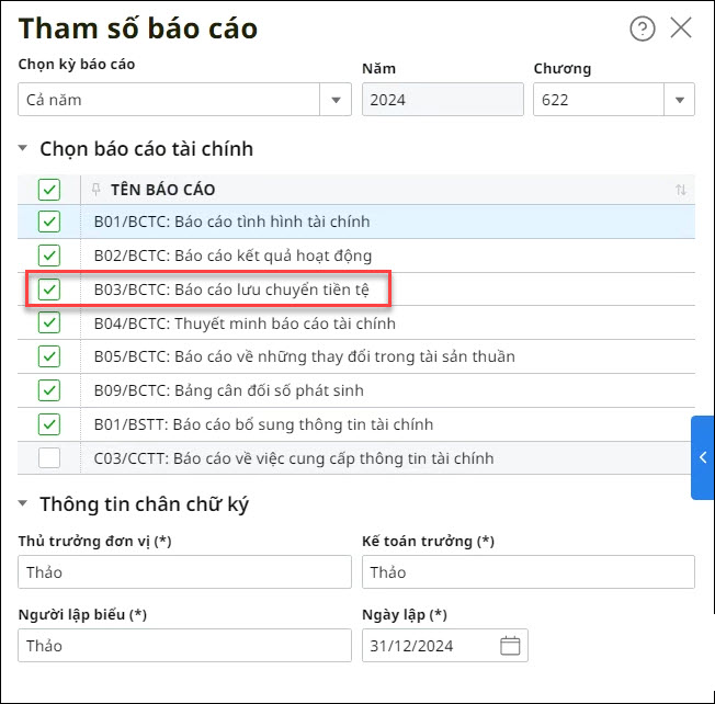 Bước 2: Tại bảng Tham số báo cáo, chọn báo cáo cần lập, ví dụ Báo cáo lưu chuyển tiền tệ . Nhấn Đồng ý