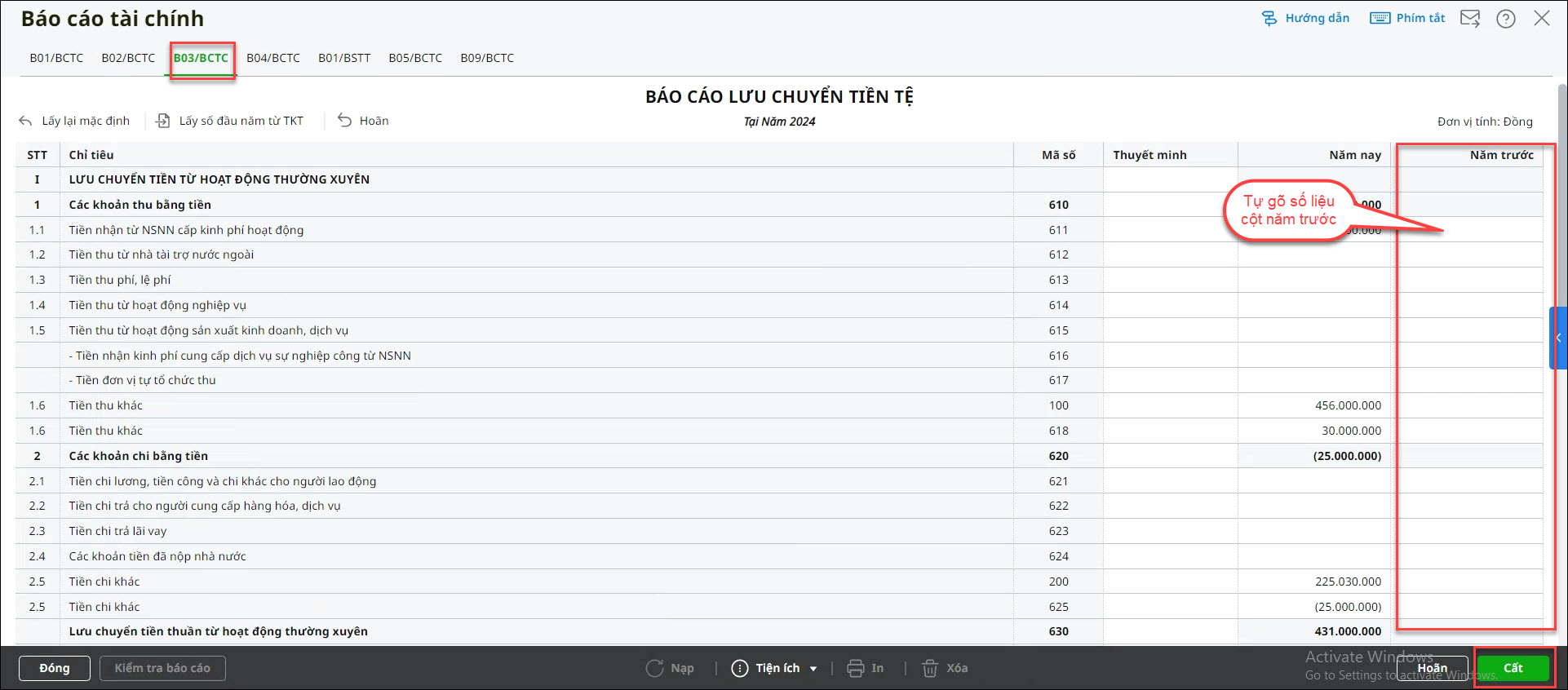 Bước 3: Tích vào B03/BCTC, gõ tay số liệu vào các chỉ tiêu trên cột Năm trước, rồi nhấn Cất.