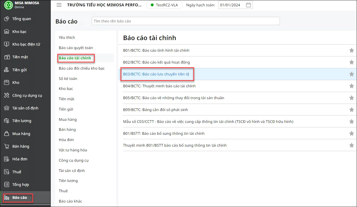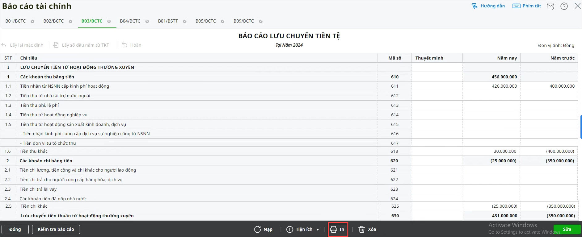 • Cách 2: Vào Báo cáo\Báo cáo tài chính\B03/BCTC: Báo cáo lưu chuyển tiền tệ
