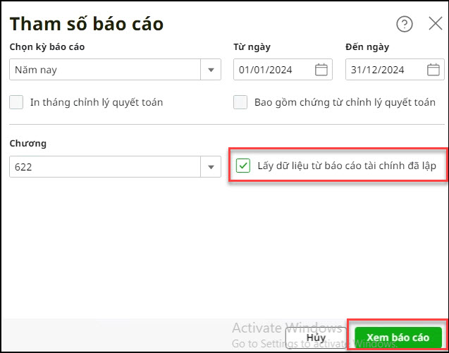 + Chọn báo cáo cần in, tích vào ô Lấy dữ liệu từ báo cáo tài chính đã lập và nhấn Xem báo cáo