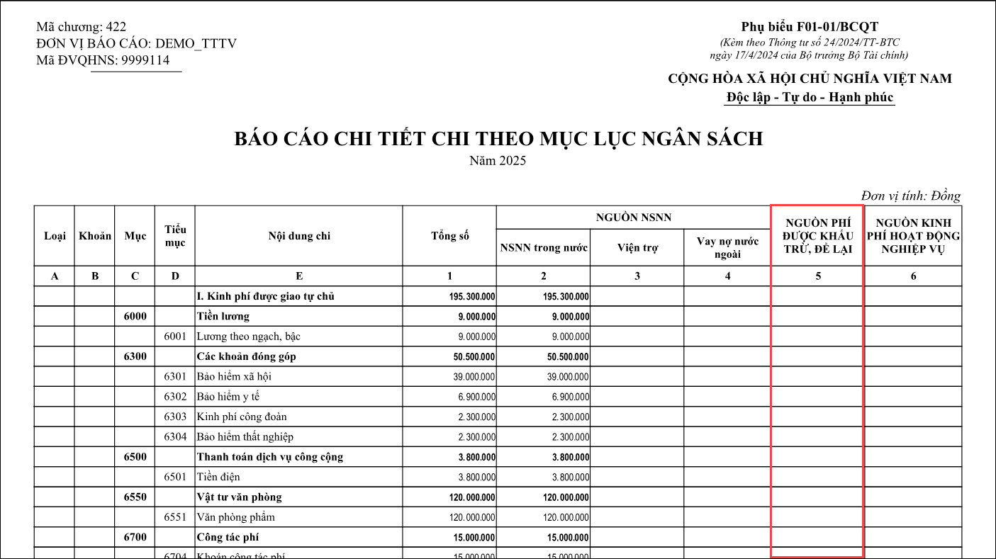 Bài viết này hướng dẫn anh/chị cách kiểm tra và xử lý khi in báo cáo Phụ biểu F01-01/BCQT: Báo cáo chi tiết chi theo mục lục ngân sách thấy cột Nguồn phí được khấu trừ để lại (Cột 5) không lên số liệu.