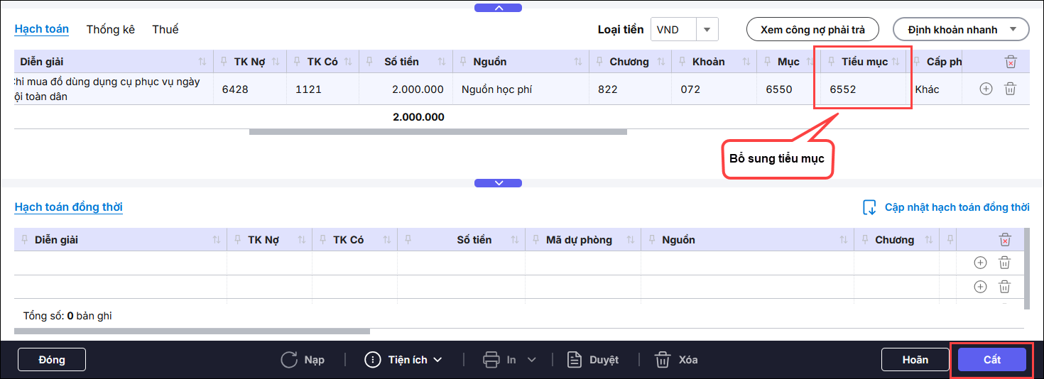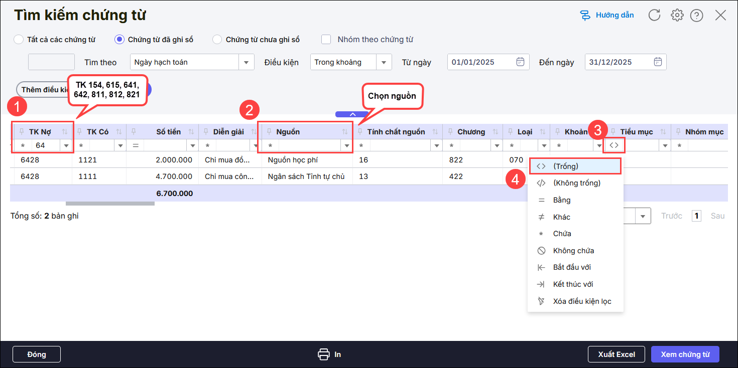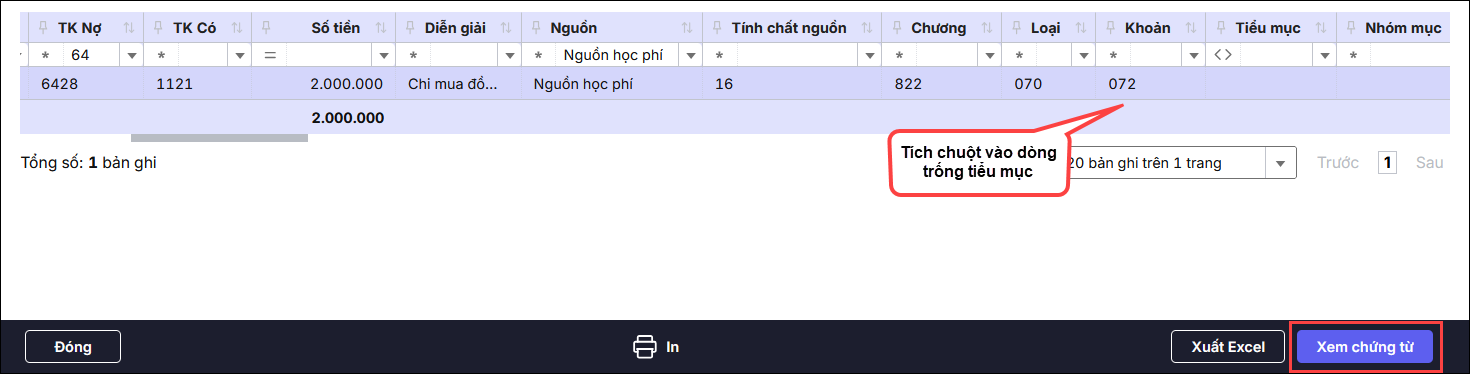 - Lọc tìm các chứng từ đang bỏ trống thông tin tiểu mục.