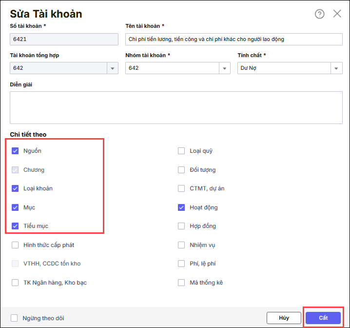 - Kích đúp chuột lần lượt vào các TK 154, 641, 642, 811, 812, 821 để tích chọn chi tiết theo Nguồn, Loại – Khoản, Mục, Tiểu mục. Nhấn Cất