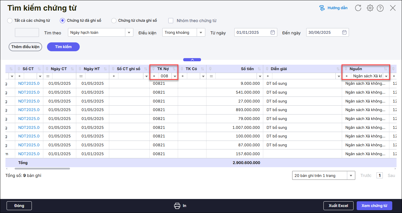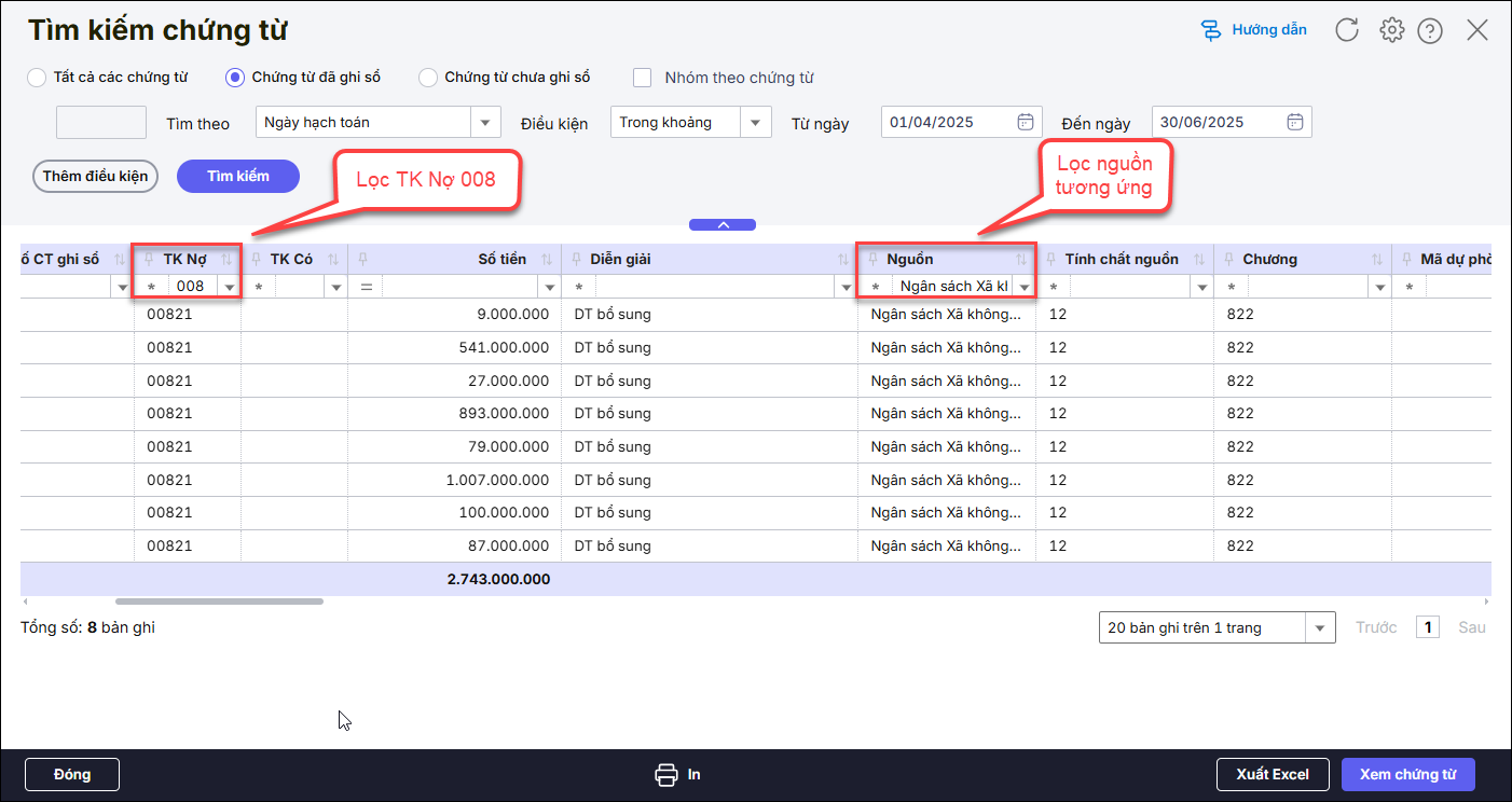 Bước 4: Điền 008 ở ô TK Nợ, chọn nguồn cần kiểm tra ở cột Nguồn