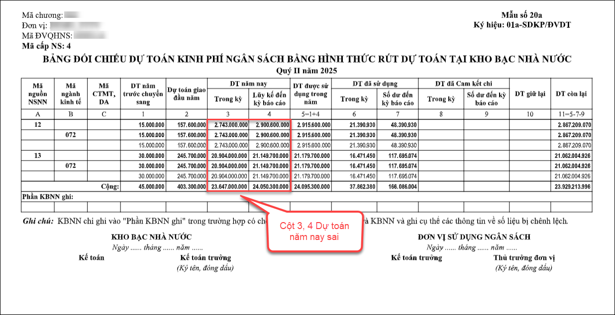 Khi in mẫu số 20a, Cột 3, 4 Dự toán năm nay lên không đúng thì làm thế nào?
