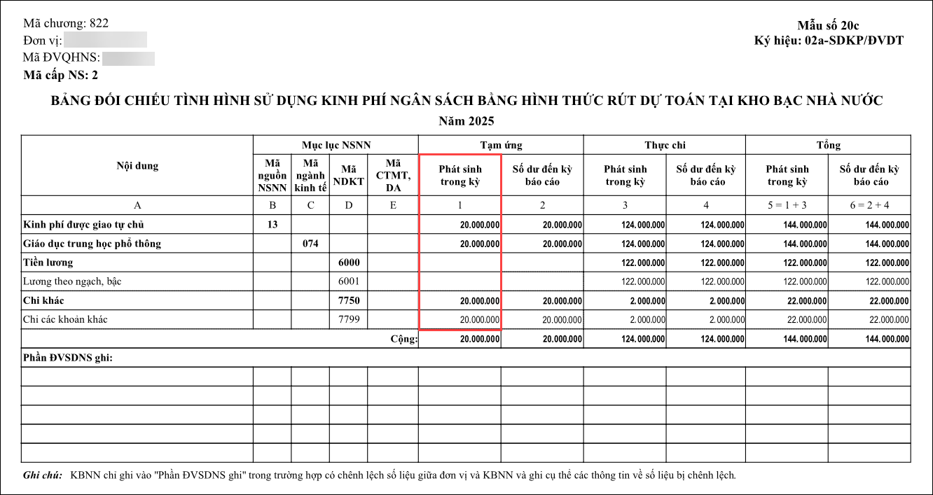 Ví dụ: Trong năm 2024, đơn vị rút tạm ứng 20.000.000đ và thanh toán tạm ứng hết nhưng in báo cáo mẫu số 20c cột số tạm ứng phát sinh trong kỳ (Cột 1) giá trị vẫn là 20.000.000đ.