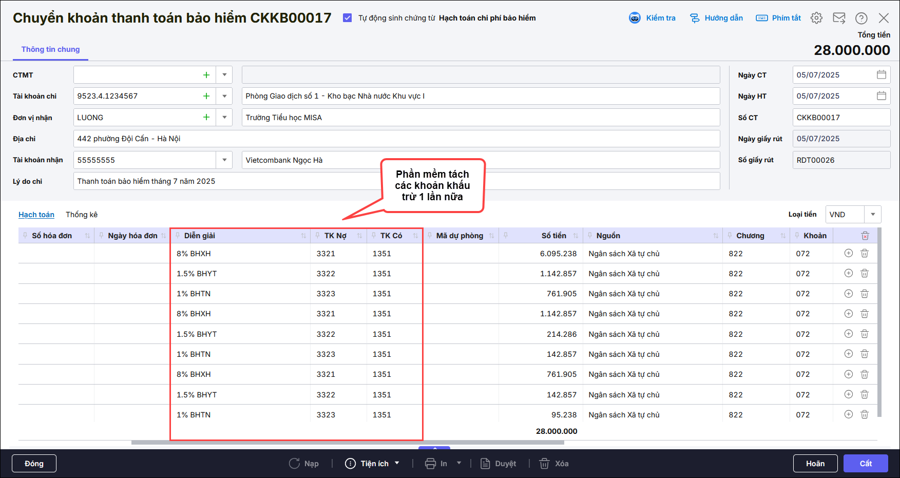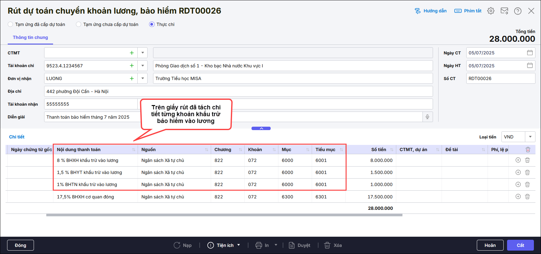 • Khi nhập giấy rút dự toán chuyển khoản bảo hiểm đã tách chi tiết đến từng khoản khấu trừ BHXH, BHYT, BHTN