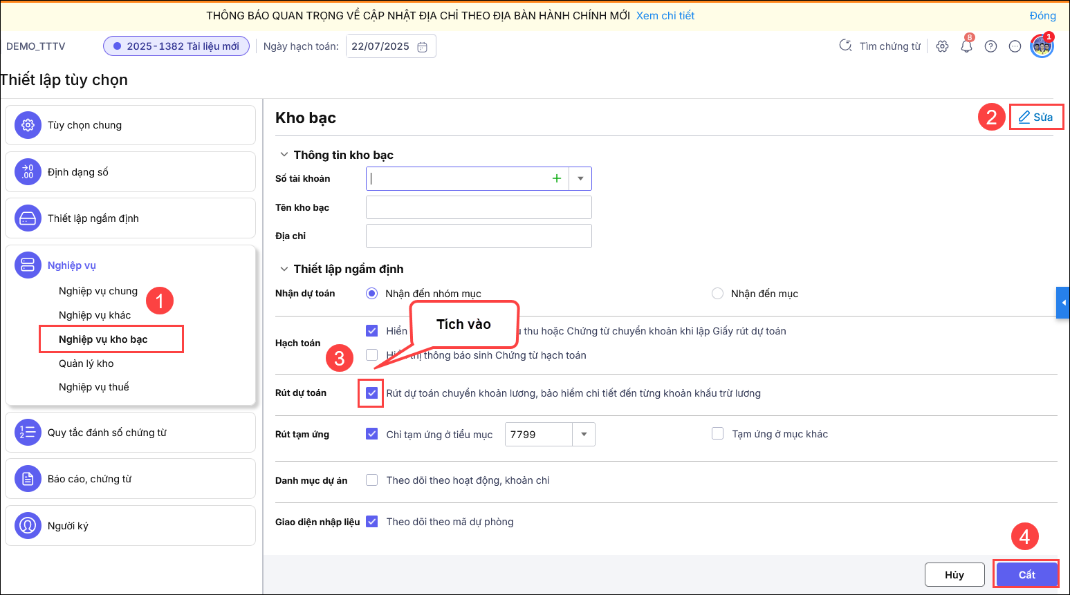 Bước 2: Chọn tới phần Nghiệp vụ kho bạc, nhấn Sửa, tại mục Rút dự toán tích vào ô Rút dự toán chuyển khoản lương, bảo hiểm chi tiết đến từng khoản khấu trừ lương, sau đó nhấn Cất.