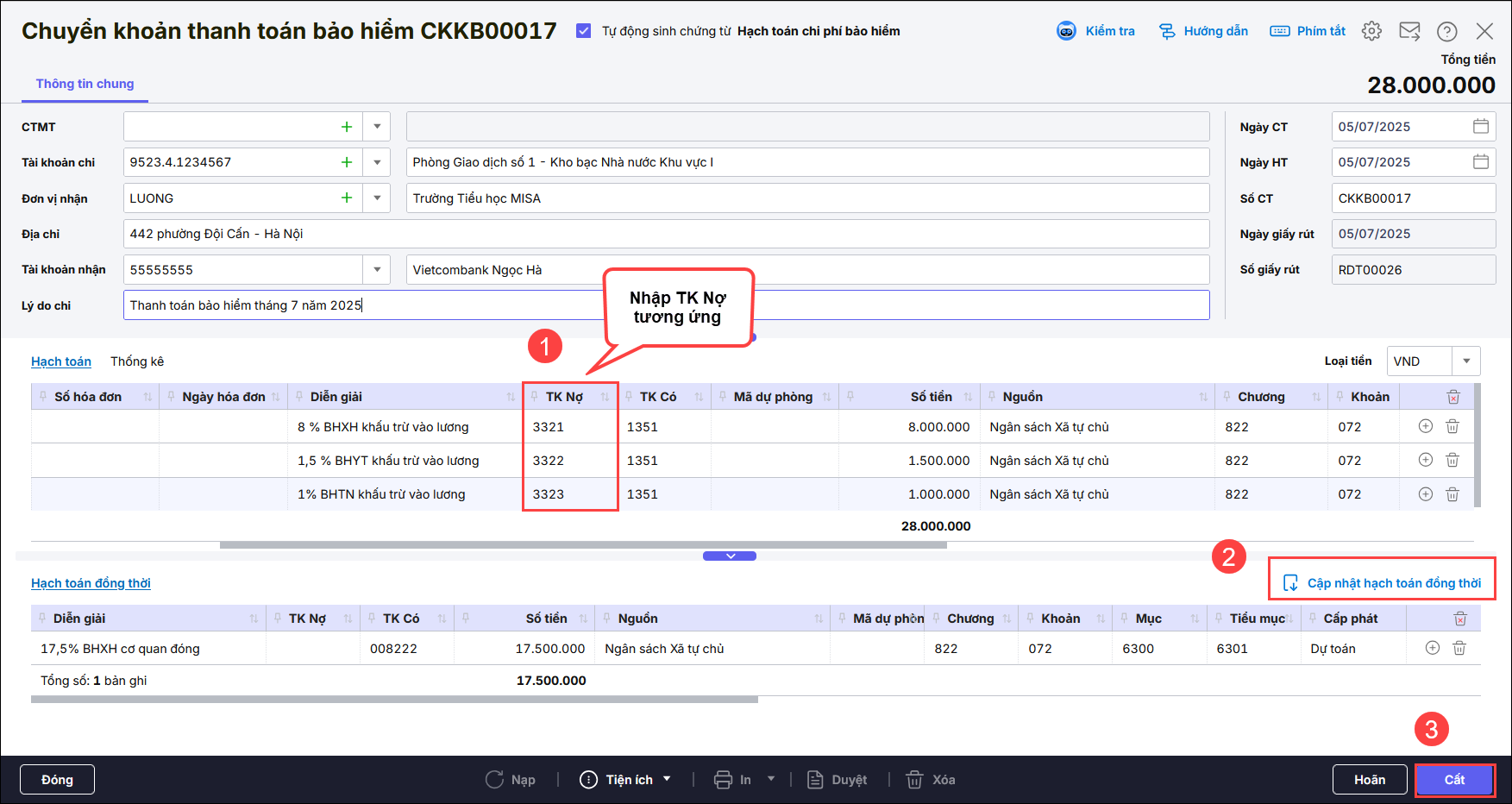 Bước 3: Bạn mở lại giấy rút dự toán chuyển khoản lương, bảo hiểm và sinh lại Chứng từ chuyển khoản thanh toán bảo hiểm, bạn bổ sung tài khoản Nợ tương ứng với từng khoản chi bảo hiểm