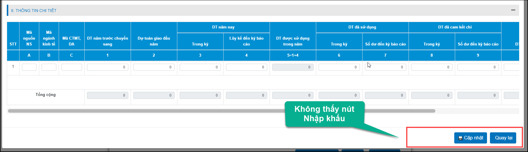 Khi trang web bị dịch anh/chị sẽ không thấy đúng tên 3 phím chức năng là Nhập khẩu, Cập nhật và Quay lại như bình thường mà bị hiện thành tên khác ví dụ chữ Nhập khẩu hiển thị bằng chữ cho như hình dưới đây: